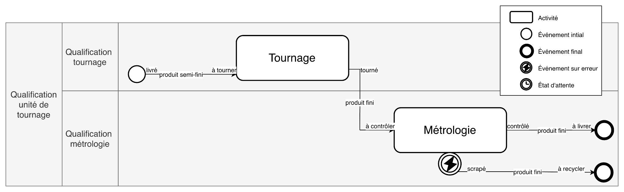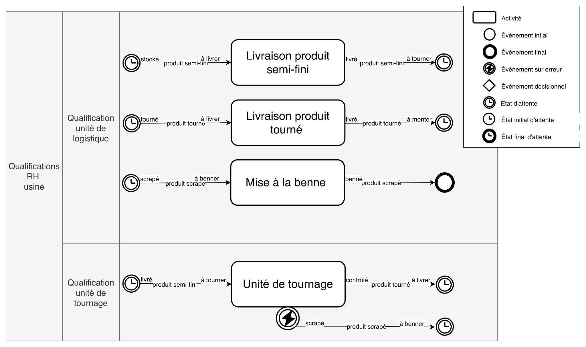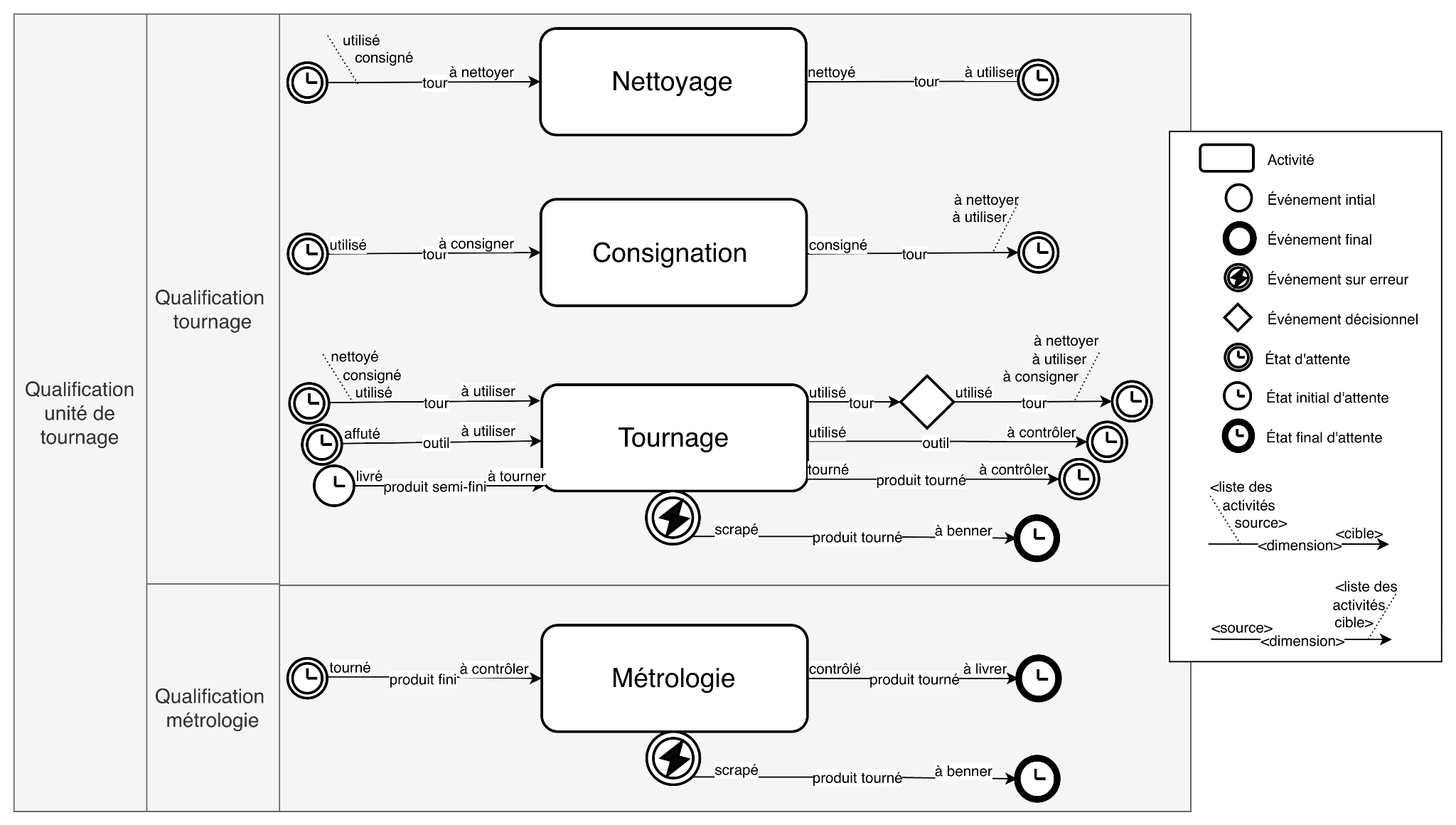 Le Business Process Modeling Notation (BPMN) est le standard international qui prend le mieux en compte les processus événementiels multi acteurs. Cependant, comme le Value Stream Mapping (VSM), le Flowchart ou le Process Flow Diagram (PFD), il détaille principalement le cycle de vie de la dimension Produit. Sa structure multi acteurs permet également de distinguer la dimension qualification.