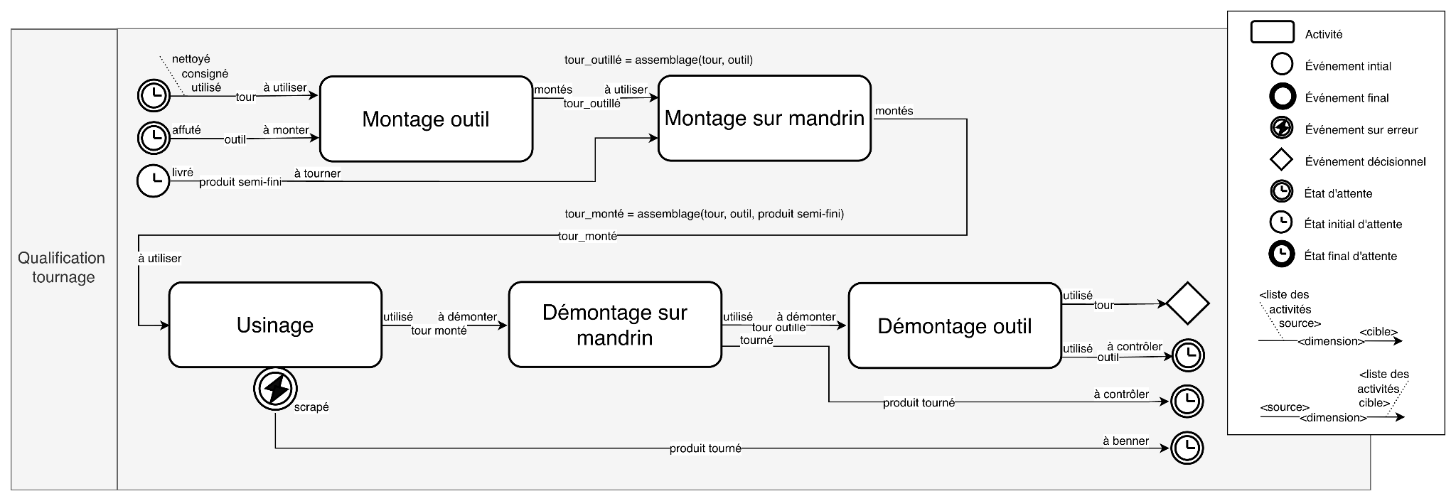 Comme nous l’avons vu, le pilotage d’un processus de production via un Jumeau Numérique nécessite de modéliser ses activités en prenant particulièrement en compte :
