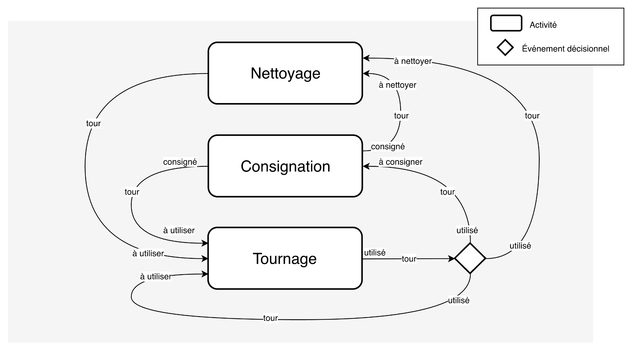 La modélisation par MaE peut être contre-intuitive car sa représentation en graphe n’est ni spatiale, ni chronologique. Elle représente les transitions autorisées entre une liste finie d’états ou d’événements décisionnels. La particularité d’une transition pointant vers un événement décisionnel est d’ignorer l’activité cible (l’infinitif de la construction syntaxique).