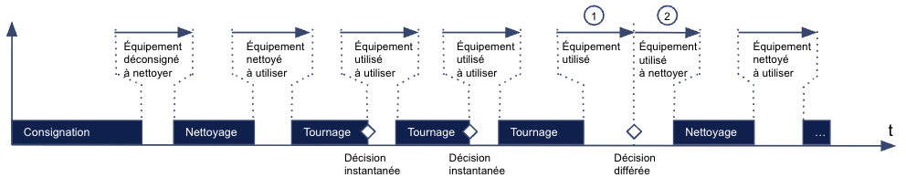 À la différence de la dimension Produit, la dimension Équipement n’a pas un cycle de vie linéaire. Sans événement initial ni final, elle peut enchaîner de façon cyclique plusieurs activités comme on peut le voir sur les instanciations chronologiques d’états en Fig_5 qui réitèrent plusieurs états d’activité et de transition. Si, à l’issue d’une activité la décision est instantanée, l’attente de celle-ci n’a plus lieu d’être et n’apparaît donc pas sur la chronologie.