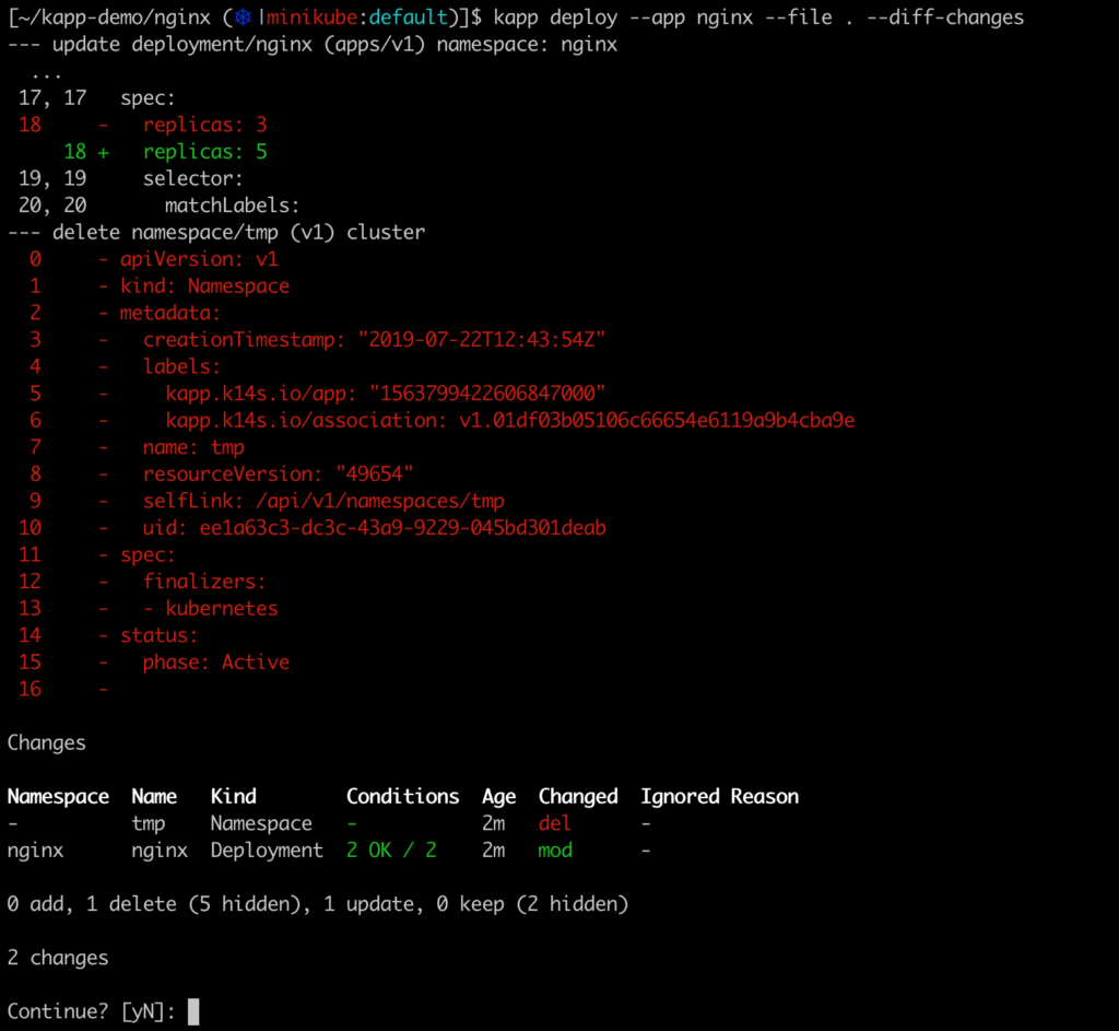 Notons que dans l’exemple ci-dessus, la définition du namespace a été supprimée. On voit donc que kapp détecte les ressources qu’il est nécessaire de supprimer, ce qui est un vrai plus de cette solution, par rapport à kubectl par exemple.