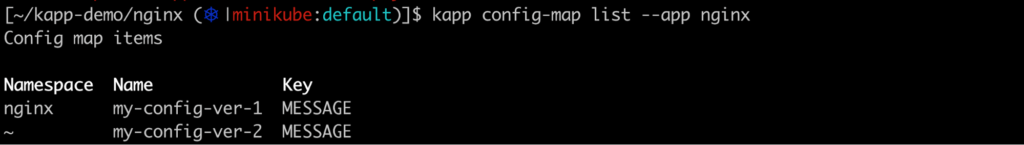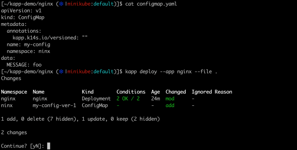 Pour l’exemple nous créons une ConfigMap nommée my-config en la référençant dans notre déploiement. Lors de la tentative de déploiement, on observe que kapp va déployer une ConfigMap suivie d’une version (my-config-ver-1 lors du premier déploiement, my-config-ver-2 lors du second…). Son nom n’est donc pas celui que nous avons spécifié !!
