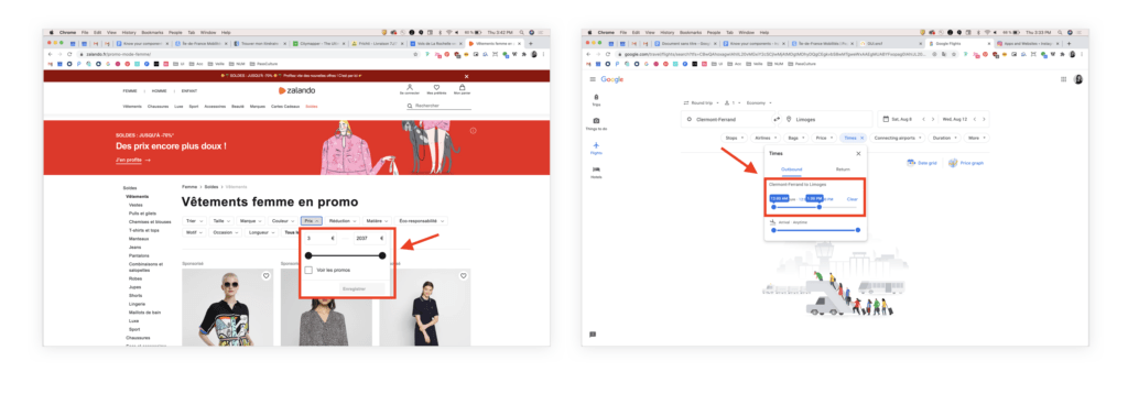 Le slider permet à l’utilisateur d’entrer une valeur numérique ou un intervalle numérique relatif (le min et le max sont visibles). Il convient si le nombre de valeurs proposées est supérieur à 4 et si la valeur exacte demandée n’est pas connue par l’utilisateur. Ce composant convient par exemple très bien pour définir une fourchette de prix.