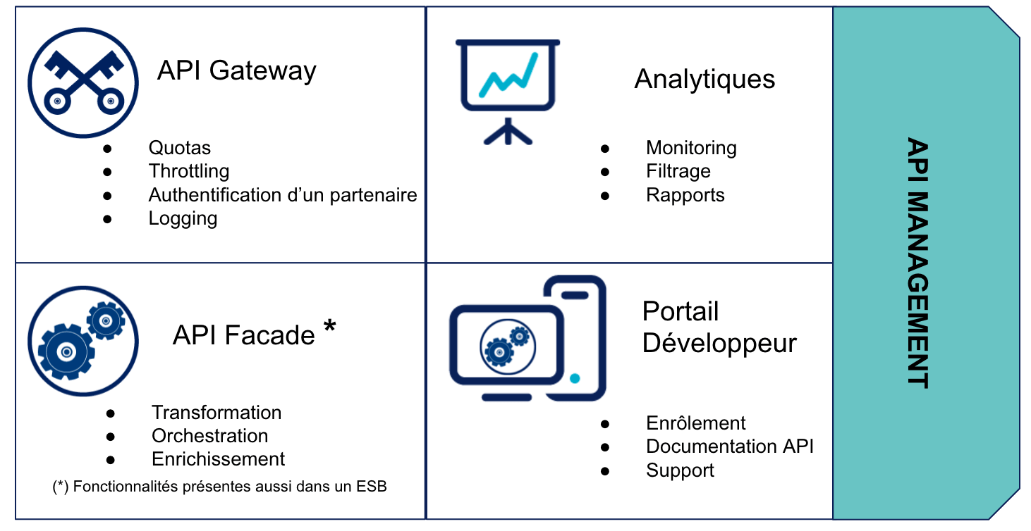 API Facade : Fonctionnalité optionnelle, qui abstraint la complexité d'un SI en proposant de la transformation SOAP vers REST ou l’orchestration des requêtes par exemple.