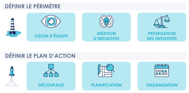 Deux journées pour 6 ateliers afin de clarifier et définir le périmètre de travail (vision d’équipe, idéation d’initiatives, prioritisation) puis de construire le plan d’action et la mise en œuvre (découpage, planification, organisation).