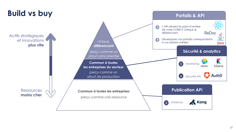 L’heure est au bilan et il est partagé. Environ 60% des promesses sont tenues. L’important est d’identifier ses besoins et de comprendre comment tirer parti des meilleures solutions, en les combinant. Le build vs buy est votre driver pour avancer dans l’exposition de vos API.
