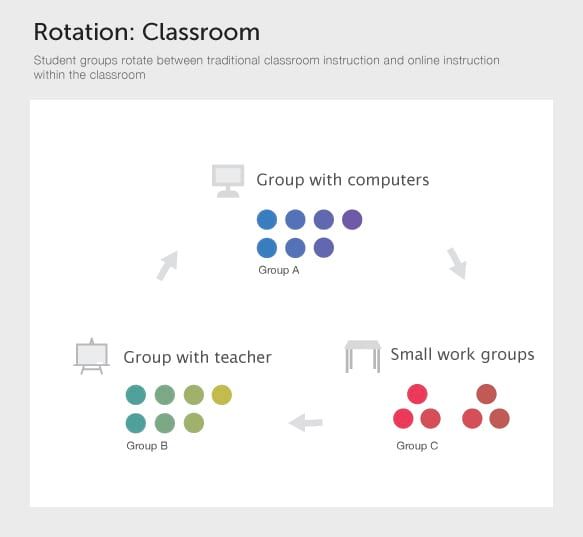 - Le modèle de rotation: deux groupes d’une même classe alternent entre des cours suivis avec un enseignant et des cours suivis en ligne. Ce modèle peut aussi varier, on peut très bien intégrer un troisième groupe d’élève qui travail sur des exercices comme montrer dans le schéma.