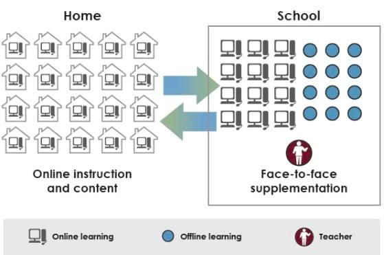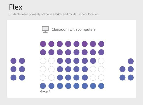 - Le modèle flexible: les cours en ligne sont suivis dans une classe pour permettre aux étudiants d’être flexible sur leur emploi du temps. L’enseignant est disponible en cas de besoin pour l’étudiant seul ou un groupe d’étudiants.