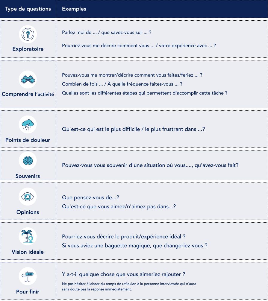 👉 Questions thématiques (30 à 40 minutes) : Recueillir des informations sur les thématiques cibles.