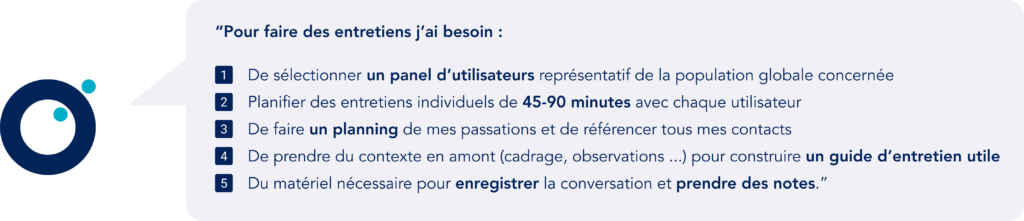 L’entretien est l’une des méthodes qualitatives qui permet d’échanger avec l’utilisateur sur son environnement ou contexte afin de comprendre ses besoins et frustrations.