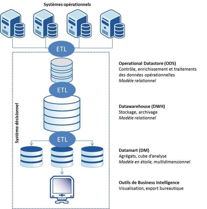 L’architecture décisionnelle « traditionnelle » fonctionne comme un pipeline d’alimentation par étages des systèmes opérationnels jusqu’aux datamarts. Chaque étage dispose de son modèle de données spécialisé optimisé pour sa mission, pour garantir des performances idéales à chaque étage.