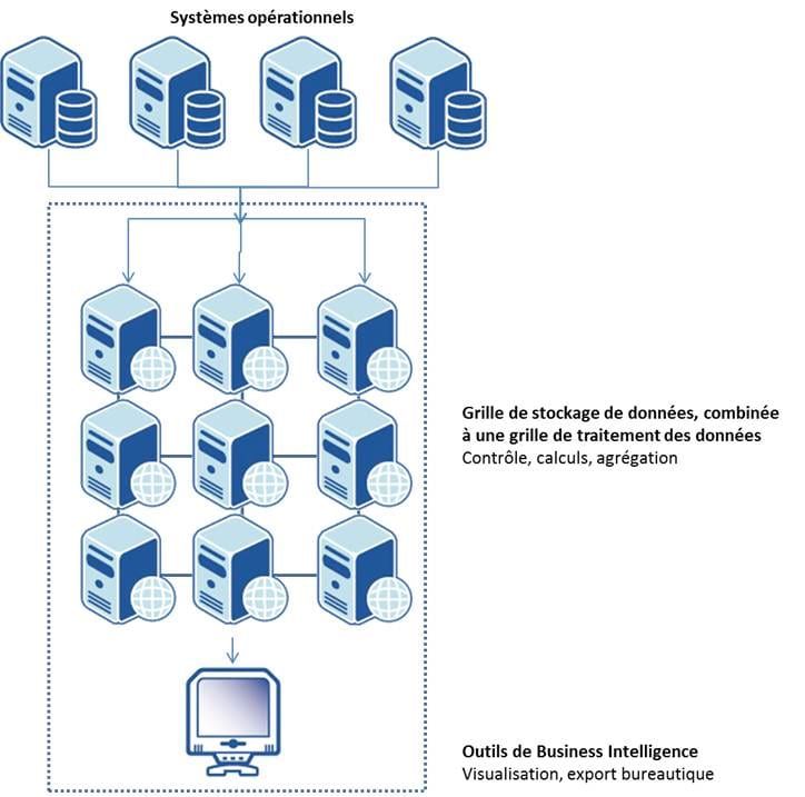 L’architecture d’un système In Memory repose sur la capacité à monter en RAM l’ensemble des données à analyser dans un système unique qui assure l’ensemble des fonctions décisionnelles.