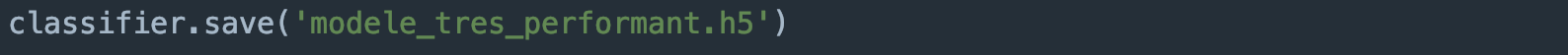 Il ne nous reste plus qu’à sauvegarder ce modèle pour pouvoir le déporter de la machine d’entraînement vers le Raspberry. Keras propose le format .h5 de sauvegarde pour l’objet python correspondant au modèle.