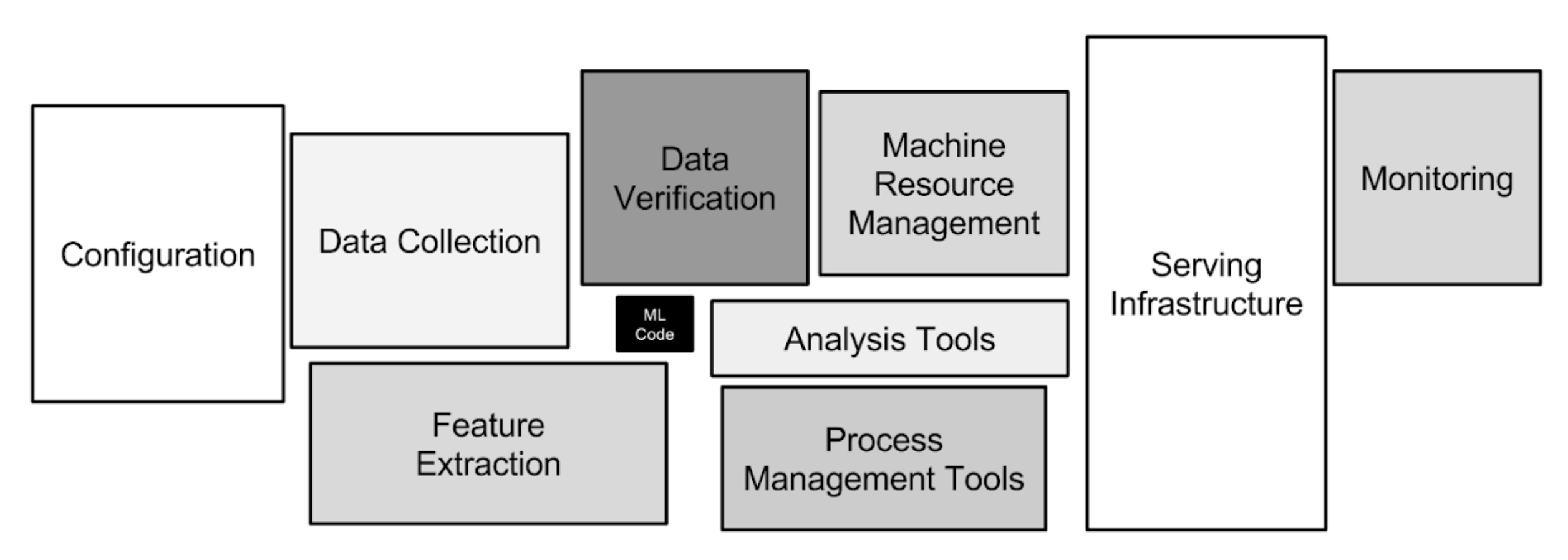 Ce cas d’usage, d’apparence simple, recèle de toutes les difficultés que propose la mise en production d’un modèle de Machine Learning. On pourrait penser de prime abord que la complexité réside dans la création d’un modèle de Deep Learning robuste et fiable, et que le reste est trivial. Bien sûr, il n’est pas évident de concevoir un tel modèle, cependant, comme l’illustre Google dans un papier intitulé Hidden Technical Debt in Machine Learning Systems, le modèle et sa complexité ne représentent qu’une brique élémentaire dans le schéma d’architecture proposé ci-dessous.