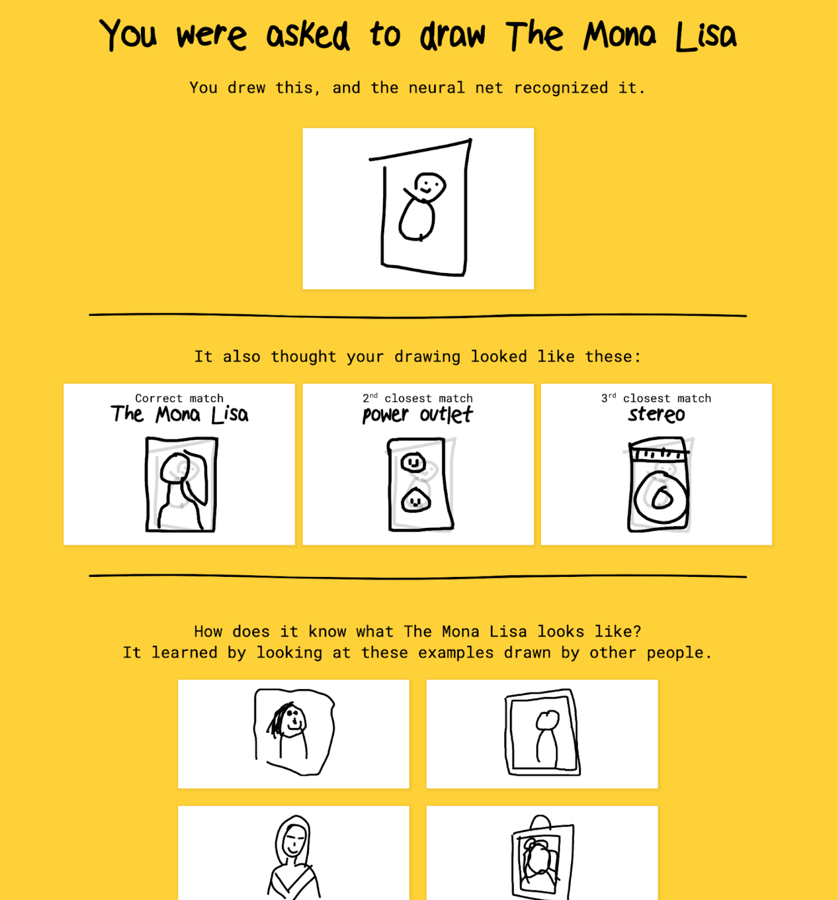 Un certain “neural net” a reconnu le chef-d’oeuvre. La ressemblance avec d’autres types de dessins, ici “power outlet” et “stereo” est aussi indiquée. Enfin, je peux admirer ce que d’autres ont été capable de faire en moins de 20 secondes (cf. fig 4).