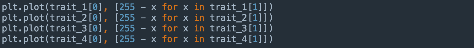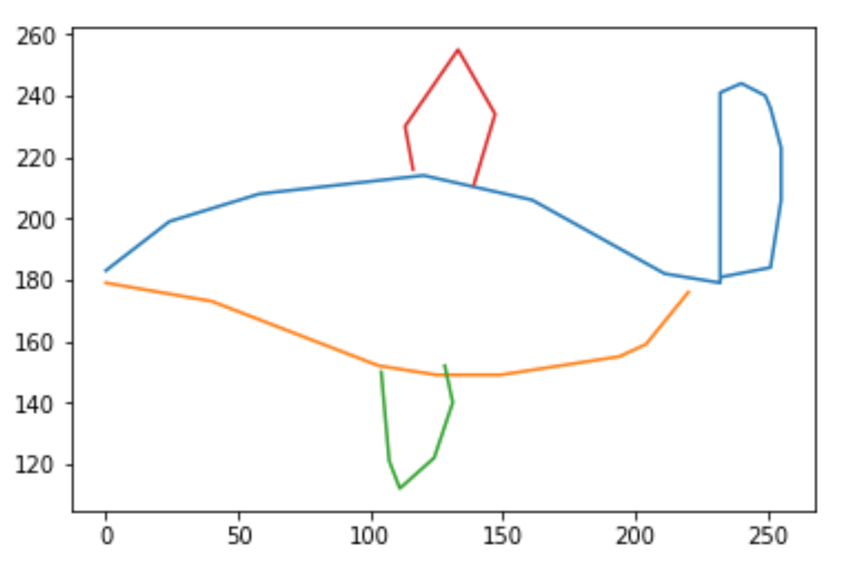 Appliquons le parser à une catégorie, par exemple airplane, en extrayant la valeur image de l’objet drawing. On pourrait s’attendre à obtenir un tableau de valeurs de pixels ou une image. En réalité, le résultat est un peu plus riche : il s’agit d’une liste des différents traits qui composent le dessin. Chaque élément de cette liste est un tuple : la première coordonnée du tuple est l’évolution en abscisse du trait, et la seconde est l’évolution en ordonnée ! Par exemple, prenons une image composée de 4 traits :