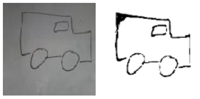 Or le modèle ne peut pas généraliser sur des données trop éloignées par rapport à ce qu’il a vu en entraînement. Un dessin de voiture trop sombre ne saurait être inféré en “voiture” si le modèle n’a pas eu accès à ce type d’exemple durant la phase d’entraînement. On propose donc un preprocessing simple : convertir la photo en noir et blanc et déterminer une valeur seuil pour le noir et le blanc. Les pixels dont la valeur est inférieure (respectivement supérieure) à ce seuil auront comme nouvelle valeur 0, c’est à dire noir (respectivement 255), c’est à dire blanc.