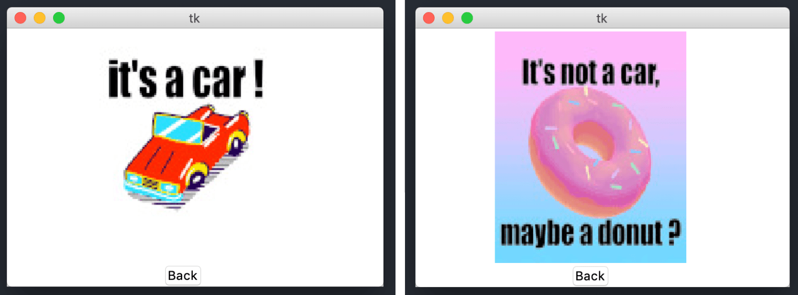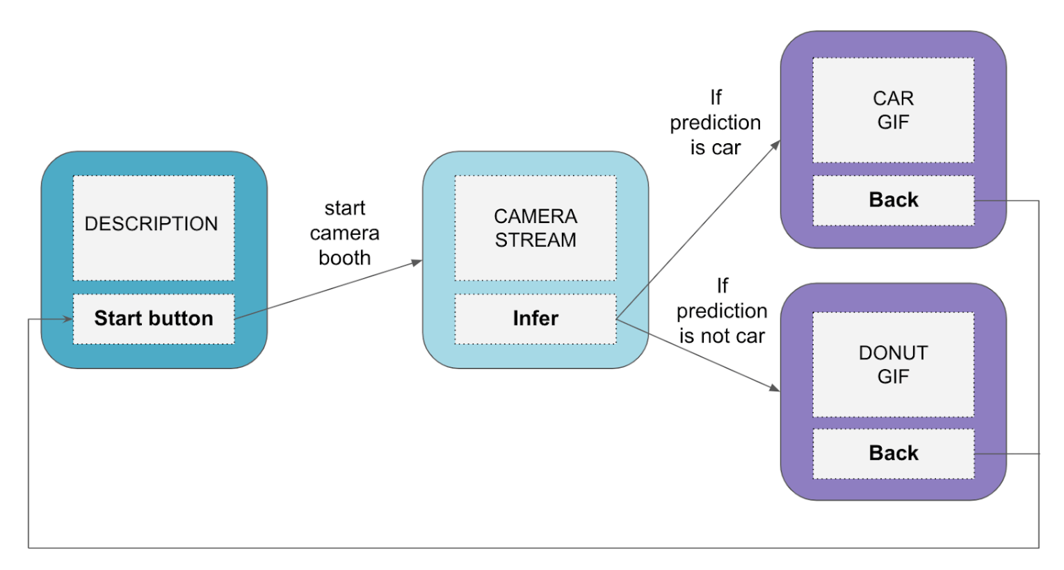 • Un GIF : Le modèle fait une inférence sur la photographie et si la prédiction est “voiture”, le troisième écran affiche un GIF de voiture. Sinon, il affiche un GIF de donut. Un bouton “back” permet de revenir à la page d’accueil