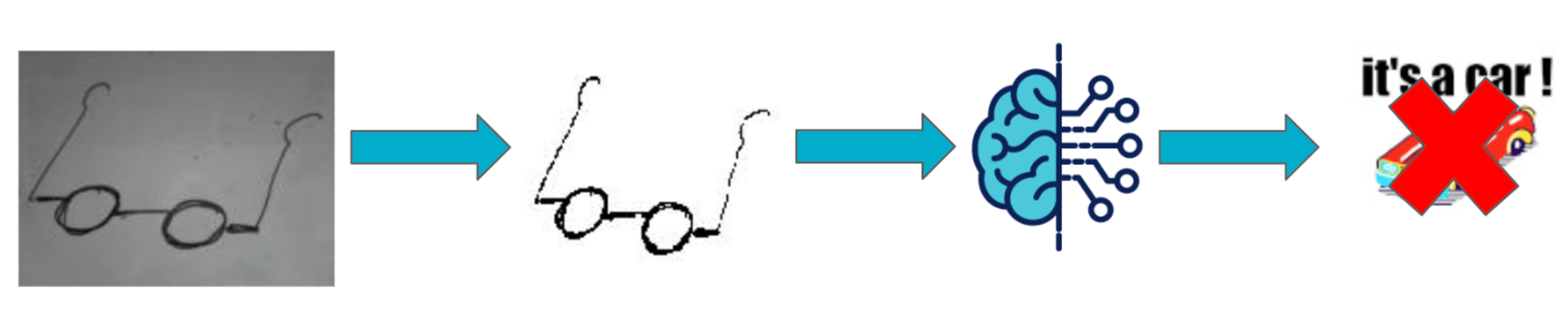Tout d’abord, comme il est coutume de dire en Machine Learning, suivant l’intuition du statisticien George Box : “Tous les modèles sont faux, certains sont utiles”. Compte tenu de la diversité de dessins que le modèle a eu en entraînement, notamment pour des exemples de non voitures, il est assez simple de trouver un dessin qui le mette en défaut. Un de ces exemples est en figure 7. Ce dessin de lunettes, avec des verres ronds, pousse le modèle à prédire qu’il s’agit d’une voiture. Il semblerait que l’agencement et la forme des verres induisent le modèle en erreur.