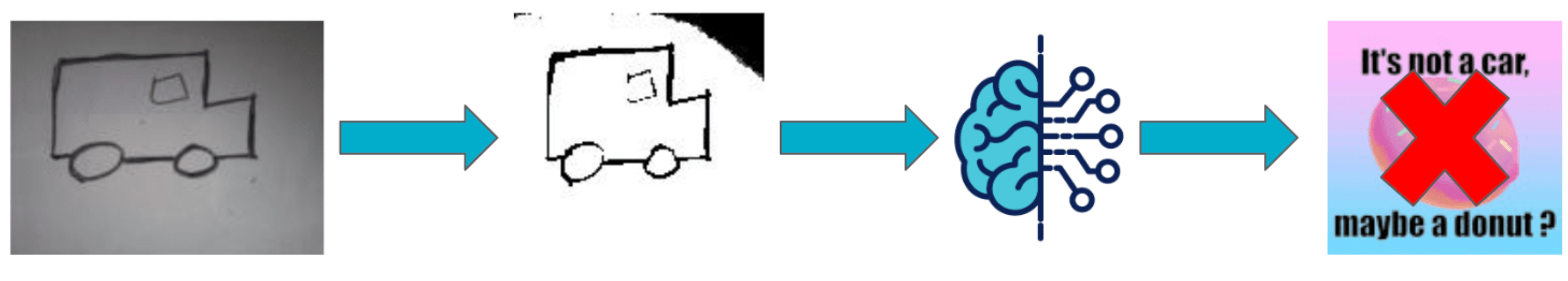 En revanche, nous avons pu constater que le modèle pouvait être mis en défaut par des problèmes de mise en scène. Sur la figure 10, on constate que le dessin en entrée est une voiture. En revanche, le preprocessing tend à rendre les traits trop fins. À certains endroits, ils ont même disparu ! Pour ce même dessin, en forcissant les traits, nous obtenons une prédiction correcte. Ainsi, l’épaisseur des traits est un paramètre influant la prédiction.