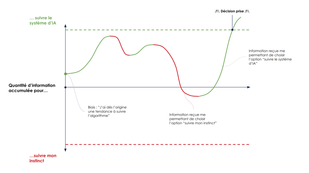 Lorsqu’on applique le modèle de prise de décision à l’utilisation d’un système de IA, on modélise en réalité la décision de faire confiance au système d'IA ou non, c’est à dire de suivre ses indications ou non.