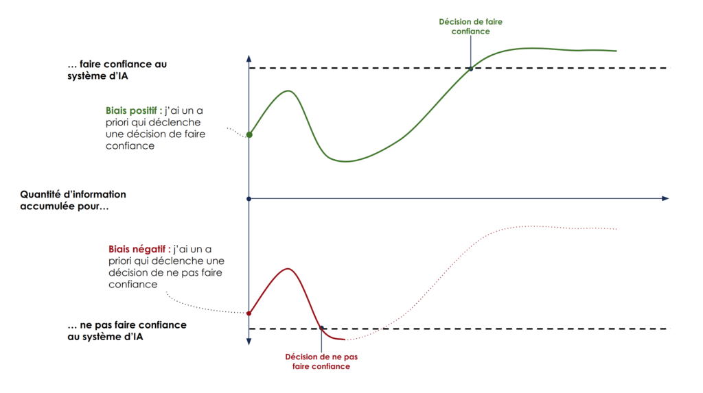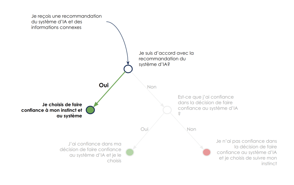 Nous avons vu que la décision de faire confiance à un système d’IA peut être perçue comme le stacking de deux décisions : celle du système (sa recommandation), puis celle de l’utilisateur de suivre ou non cette recommandation dans les cas où il est en désaccord intuitif avec le système.