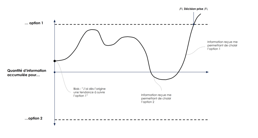 Si nous avons un a priori (biais) fort en faveur d’une option plutôt que l’autre, nous allons commencer à accumuler de l’information à un niveau plus proche du seuil de cette option.