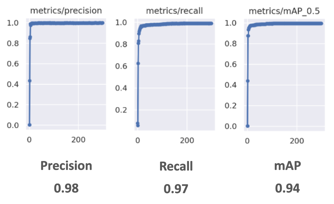Pour la dernière itération de notre génération du dataset, nous avons finalement atteint une très bonne précision pour notre modèle sur la détection des manomètres entraîné sur des données synthétiques.