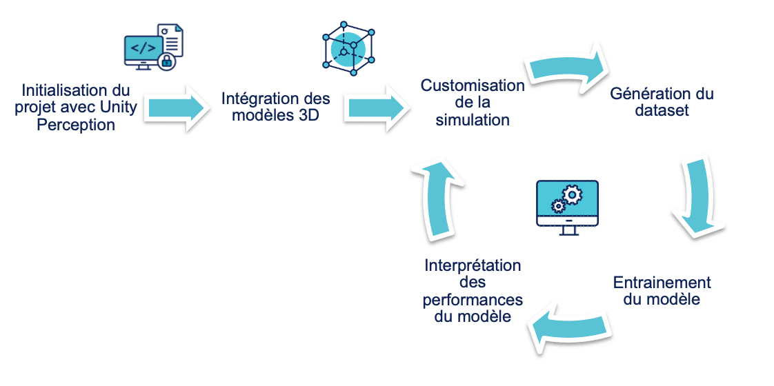 Face à un nombre important d'acteurs (développeurs Unity, 3D designers, une équipe IA et une équipe métier) il est important d'établir une bonne collaboration avec une boucle de feedback efficace et rapide pour garantir la fiabilité du modèle de ML avec l'amélioration continue. La phase de génération du dataset est la plus déterminante dans notre PoC et repose sur la méthode empirique suivante.