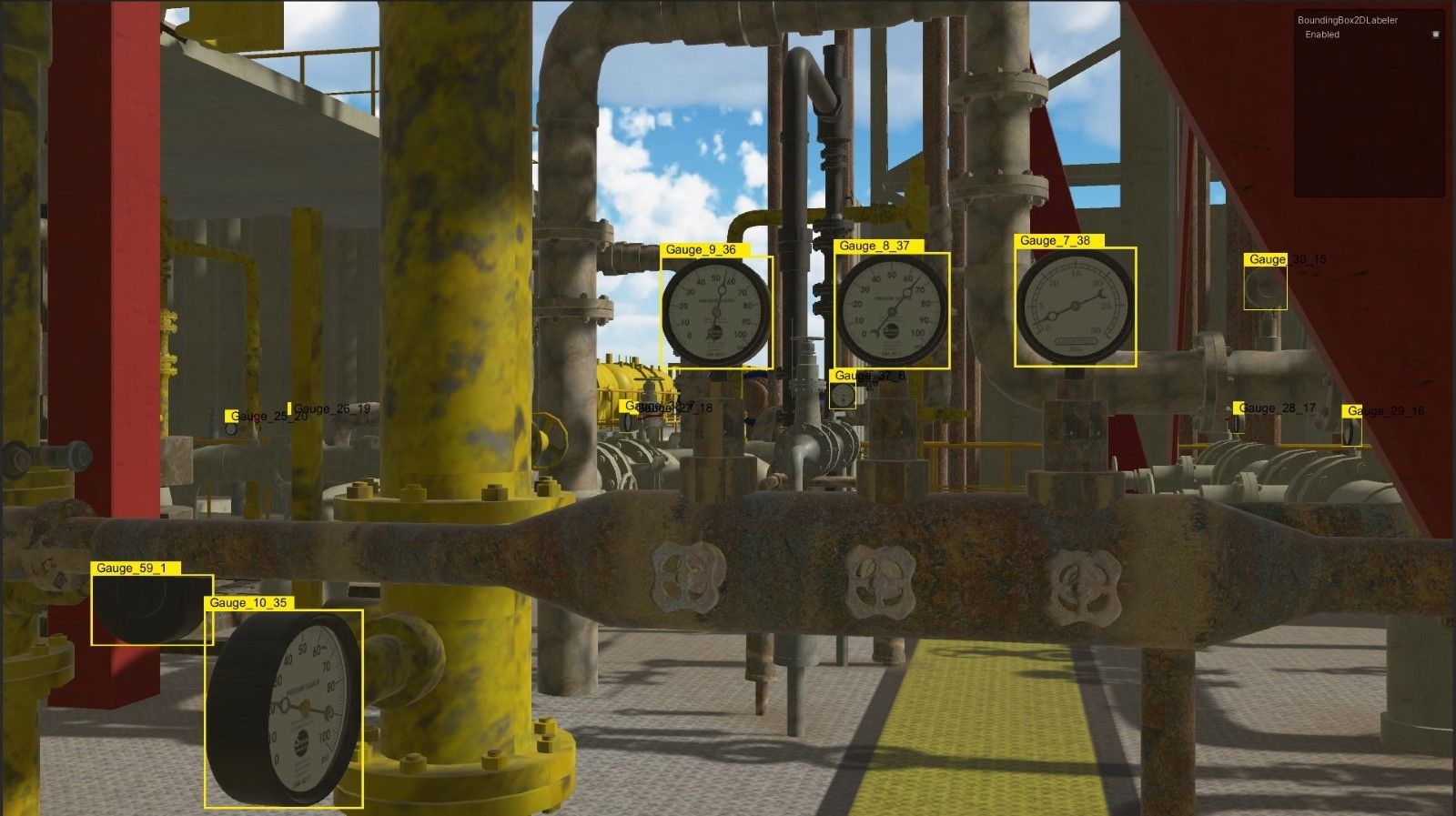 Nous avons déterminé le chemin parcouru par la caméra au sein de l’environnement le long duquel nous avons ajouté des manomètres tels qu’ils pourraient être placés dans un cadre réel. A partir du flux vidéo obtenu, chaque image est sauvegardée dans un dossier ainsi que les différentes annotations associées (par exemple la position et taille du cadre dans l’image). Nous sommes alors capables d’extraire les informations de ces fichiers pour alimenter notre modèle de machine learning. Dans Unity nous pouvons personnaliser l'extraction des images au bon format pour l'équipe IA (416 x 416 pixels) et ne retourner dans un fichier JSON que les données intéressantes pour le modèle, ici la position et la taille de la bounding box (les bounding box sont en 3D et nous détectons les coordonnées en 2D en fonction de la position de la caméra).