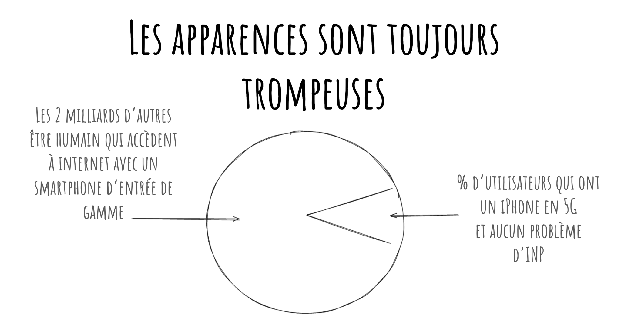Au-delà du SEO, la question de la performance est également une question d’inclusivité. Nous sommes biaisés, car nous oublions que ce que nous expérimentons au quotidien sur nos appareils mobiles et fixes n’est qu’une illusion de l'expérience réelle des utilisateurs. Ces derniers utilisent nos services dans des conditions réelles bien différentes : sur des réseaux instables, avec des terminaux souvent moins performants que les nôtres.
