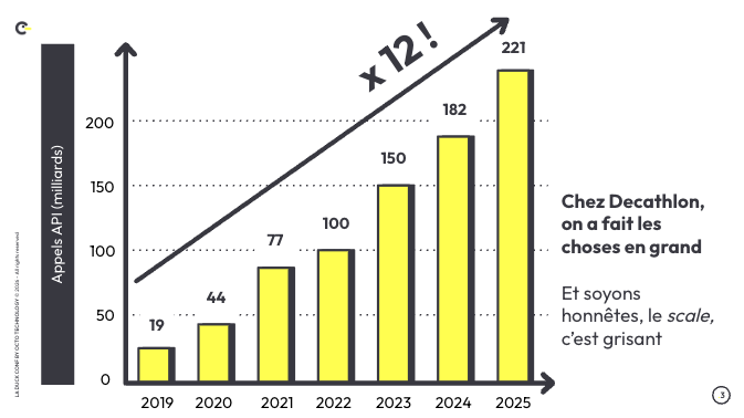 Graphique montrant une croissance de 19 à 221 milliards d'appels d'API chez Décathlon, entre 2019 et 2025, soit une multiplication par 12. La légende indique : chez Décathlon on a fait les choses en grand. Et soyons honnêtes, le scale, c'est grisant.