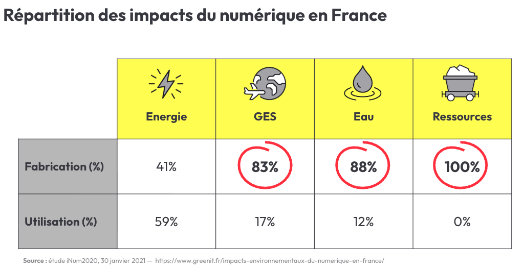 Tableau détaillant les impacts du numérique en France, pour la fabrication / l'utilisation :* Energie : 41% / 59%* GES : 83% / 17%* Eau : 88% / 12%* Ressources : 100% / 0%(mise en avant des chiffres entre double underscores)Source (datée janvier 2021) : https://www.greenit.fr/impacts-environnementaux-du-numerique-en-france/