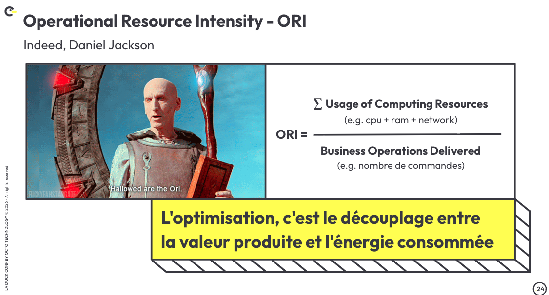 Image détaillant le calcul de la métrique Operational Resource Intensity - ORI, qui est le rapport entre la somme des ressources numériques consommées (ex. CPU, RAM, network) et la valeur business livrée (ex. nombre de commandes).Ensuite, le message : l'optimisation, c'est le découplage entre la valeur produite et l'énergie consommée.L'image contient des références SF à Stargate : "indeed, Daniel Jackson", et un clip vidéo sous-titré où un personnage prononce : "Hallowed are the Ori"