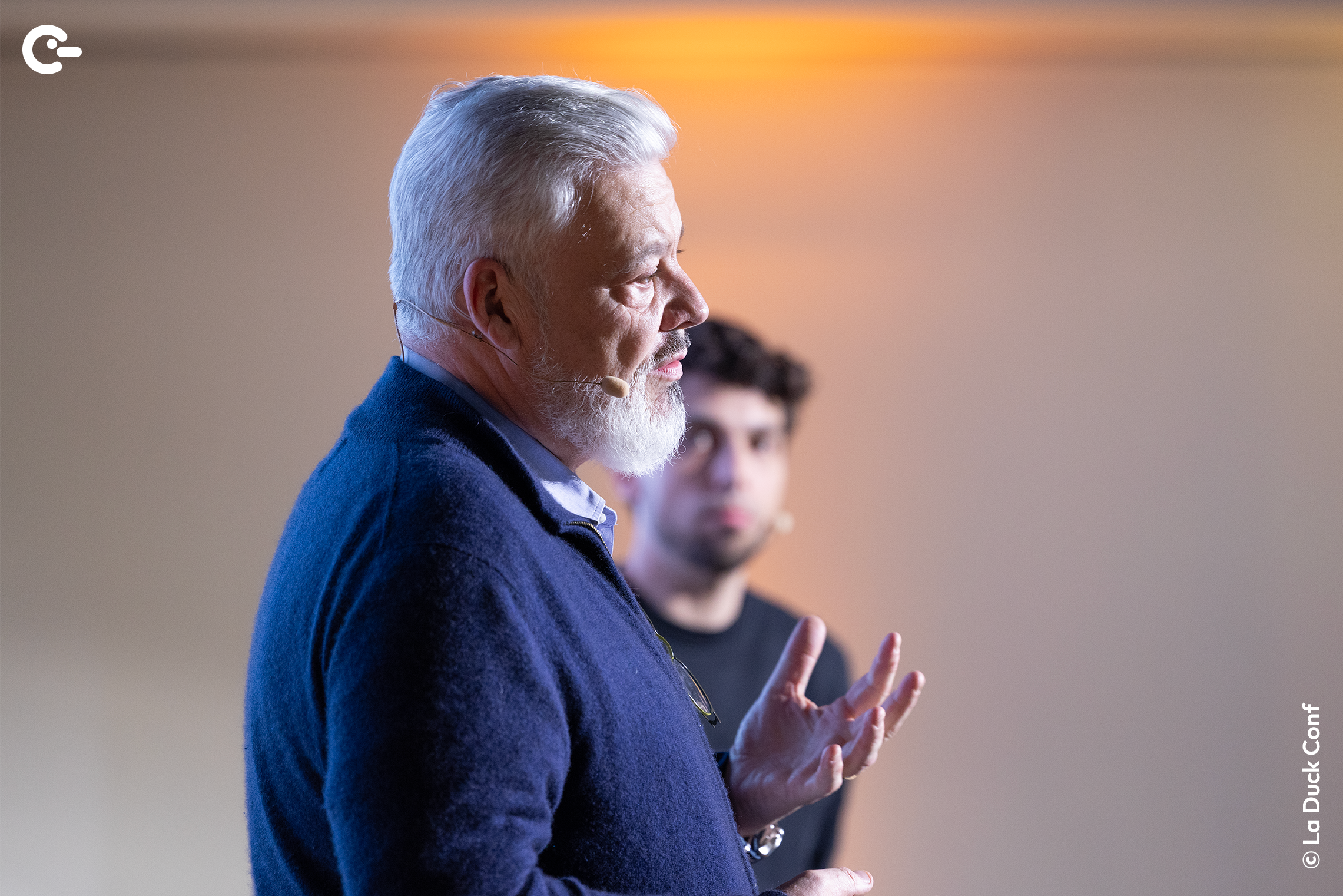 Photo de Tristan Nitot complétant les propos de Romain Taillade, au second plan