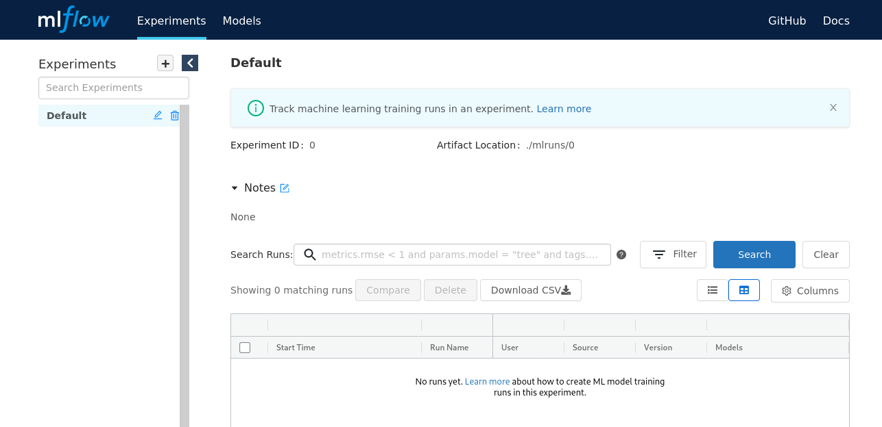 On peut remarquer en entête de la Tracking UI l'existence de deux onglets, le premier nommé Experiments que nous avons exploré, et un second nommé Models, qui va nous servir à visualiser le registre de modèle.