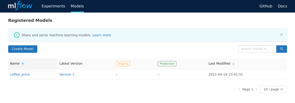 La vue Models nous permet de gérer les différents registre de modèles que l’on peut avoir, de marquer quelle version est en test et quelle version est en production pour chacun d’entre eux. La vue détaillée d’une version précise de quel expérimentation est issue le modèle, et bien plus.