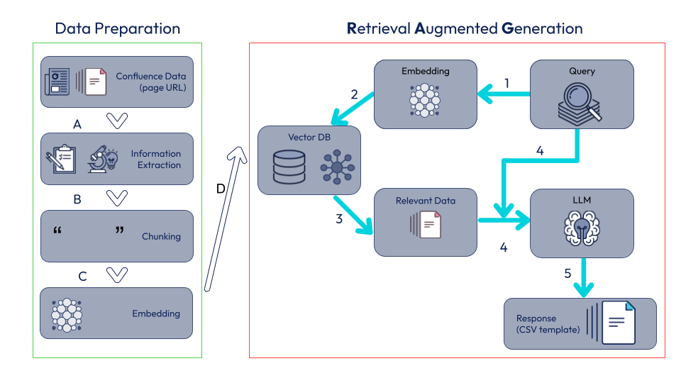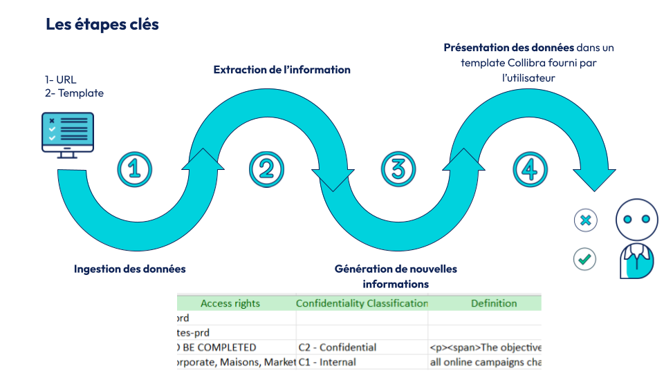 Nous avons donc réalisé une expérimentation interne dans laquelle, à partir d’informations présentes dans des pages Confluence, un outil de GEN IA qui avait pour objectif d’extraire les informations pour venir ensuite alimenter un template excel formaté selon le meta-model d’un éditeur (Collibra) :