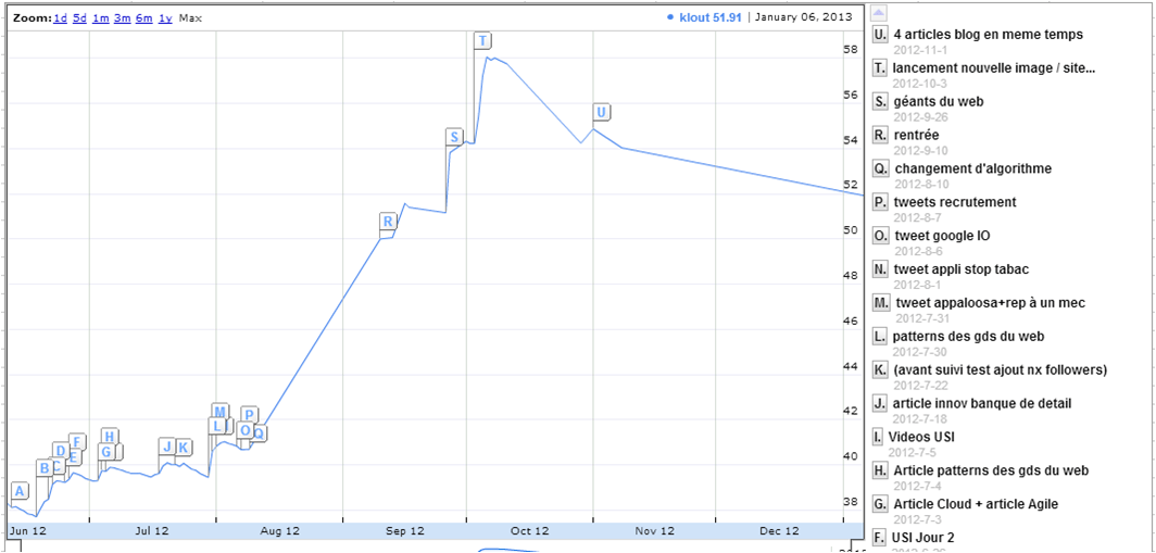 Nous avons également remarqué que les chiffres évoluent en fonction de la qualité du contenu produit par les internautes. Par exemple certains articles du blog ont été beaucoup plus retweetés et ont permis d’augmenter le nombre de followers ainsi que le score Klout (divers articles sur les Géants du Web, sur le Cloud ou encore l’Agilité).