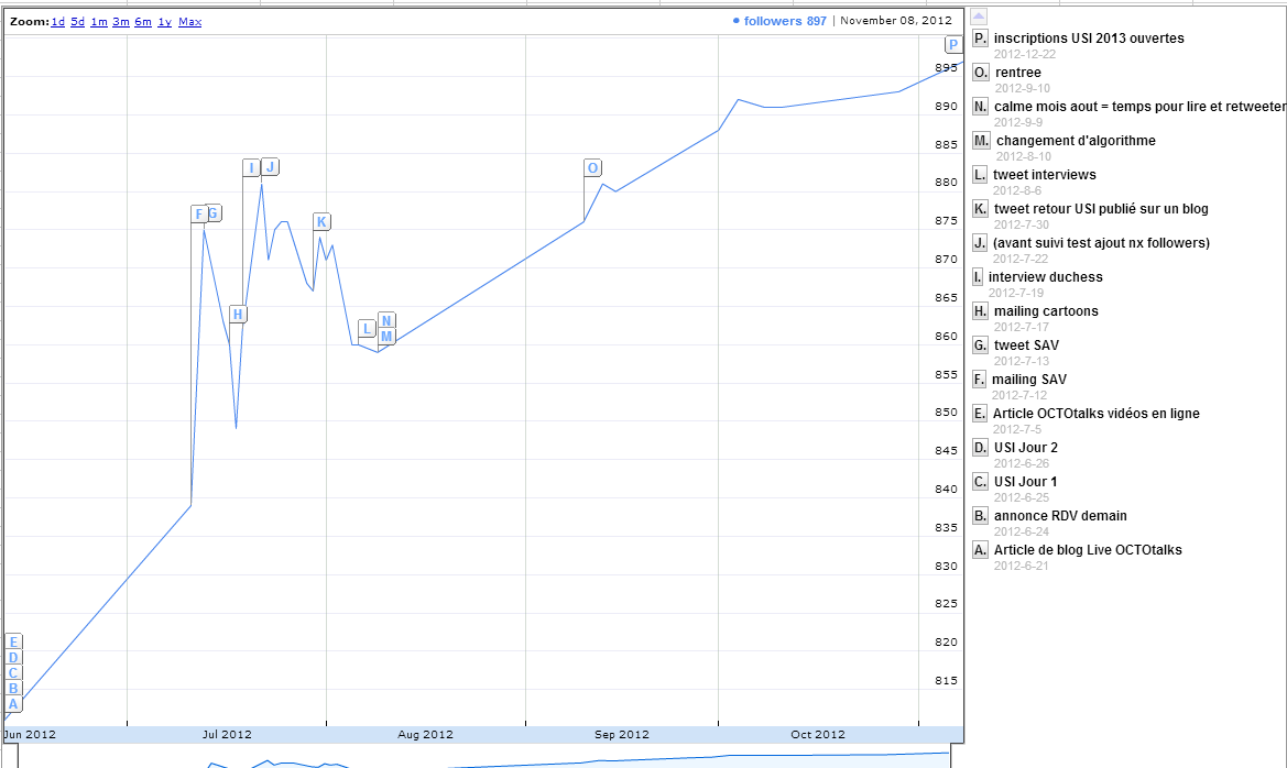 Nous avons donc initié des mesures à partir de juin 2012 sur les marques USI et OCTO et grâce aux outils de mesure suivants : Klout, PeerIndex (rapidement abandonné car peu pertinent) et les followers Twitter.