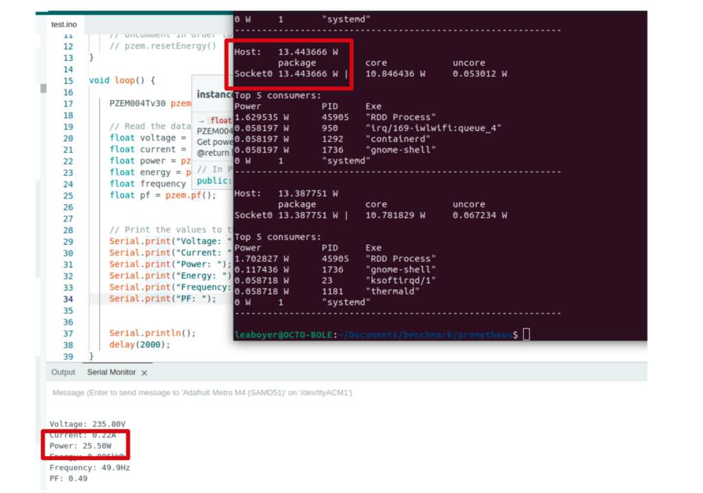 Capture d’écran: Comparaison la mesure matérielle à la mesure logicielle en montrant l’ensemble des informations exportées via la carte Metro M4 et affichées dans la sortie standard par Scaphandre