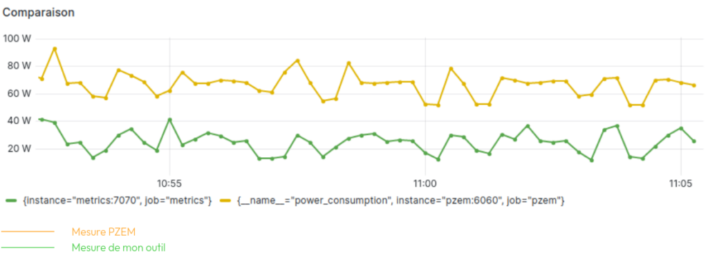 Courbe: Comparaison de la mesure matérielle à la mesure logicielle via Grafana à partir des différentes sources