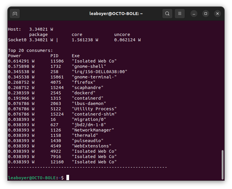 Scaphandre via stdout affiche les 20 processus les plus gourmands en énergie, ainsi que la consommation totale de l'hôte. Cependant, il est important de noter que Scaphandre ne prend en compte que la consommation des processus par rapport au processeur et gpu intégré. D'autres facteurs, tels que l'utilisation des ventilateurs, l'usure de la batterie, la mémoire, le GPU, etc., peuvent également contribuer à la consommation d'énergie d'un ordinateur. Sur certaines configurations, Scaphandre peut également fournir des données sur la consommation de tout ce qui est relié à la carte mère, mais ce n'est pas le cas sur la notre.