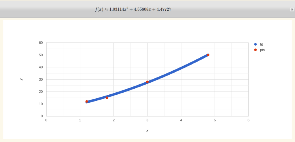 On essaie ensuite de créer une fonction à partir de ces données grâce au site dcode. On rentre notre tableau et on procède à un ajustement par hyperbole pour obtenir l’équation :