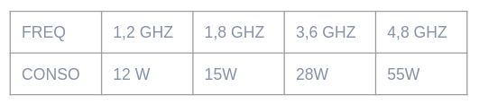 L’objectif ici est de calculer la consommation du CPU+GPU intégré sans la sonde RAPL. Pour calculer la consommation du CPU sans se servir d’outils spécifiques, on va chercher à se rapprocher de la TDP, soit l’enveloppe thermique. La TDP représente la dissipation thermique maximale du composant, exprimée en watts. Sur les processeurs Intel, “la confusion est totale” entre consommation et TDP. Grâce aux données fournisseurs, et des études en ligne, on obtient une équivalence fréquence→consommation :