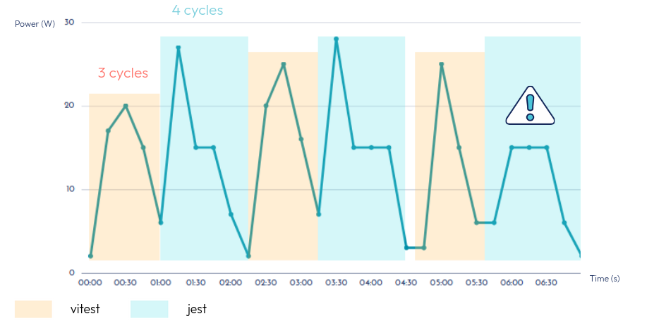 Ce que que nous pouvons remarquer sur le schéma précédent, c’est que Vitest est plus rapide et consomme en moyenne moins que Jest, mais aussi qu’une anomalie s’est introduite dans nos résultats. En effet, Scaphandre n’est pas aussi granuleux que voulu et manque parfois certaines mesures, comme ici le pic de consommation récurrent de Jest. Nous avons augmenté nos durées d'exécution minimales à plus de 15 secondes et avons répété l'expérience à plusieurs reprises pour éviter de tirer des conclusions hâtives basées sur des résultats potentiellement biaisés résultant d'une exécution isolée.