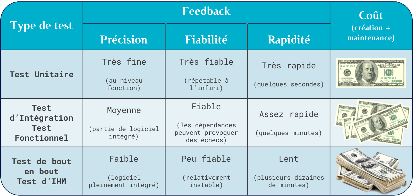 Le test, quel qu’il soit, n’a d’autre intérêt que de vous donner un feedback : “mon programme fait-il bien ce qu’il doit ?” On peut juger de la qualité de ce feedback sur 3 aspects :