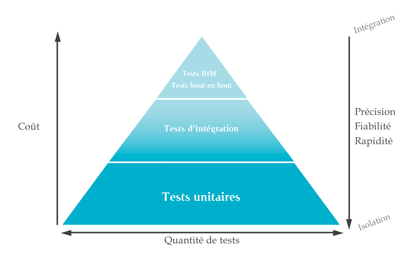 - On investit massivement sur les tests unitaires qui vont fournir une base solide à la pyramide, avec un feedback précis et rapide. Couplés à l’intégration continue, les tests unitaires fournissent un véritable harnais contre les régressions, indispensable si l’on souhaite maîtriser notre composant à moyen/long terme.
