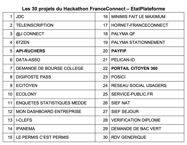 Durant tout le Hackathon, les participants ont pu solliciter une trentaine de Mentors : technique, données, pitcheurs, projet, organisation, sécurité, juridique, etc... Vendredi 19 juin, la pression monte, l’heure fatidique de présentation des applications approchait. Les derniers tests sont réalisés et les derniers conseils sont prodigués. Chaque équipe avait 3 min pour présenter son projet. A 15h, 30 projets sont présentés dans l’amphi et en live sur twitter #Etatplateforme.