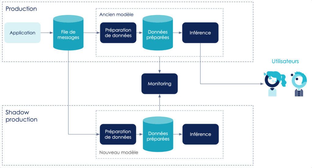 Au lieu de faire des tirs de charge avec des données générées et des smoke tests sur des scénarios limités, nous préférons opter pour la shadow production, permettant de tester le comportement de notre modèle face à des vraies données. Il s’agit de déployer notre modèle en parallèle de la production et de lui faire parvenir les mêmes données. Cela peut être fait en ajoutant une file de messages pour découpler l’envoi des données pour inférence du modèle. L’application publie alors des messages dans cette file, qui sont ensuite consommés par le modèle en production ainsi que par le nouveau modèle. Nous surveillons notre nouveau modèle en mesurant notamment ses temps de réponse, en repérant et investiguant ses erreurs 500… Cela nous permet d’apporter des changements à notre modèle avant qu’il ne soit accessible pour nos utilisateurs, donc qu’il ne reçoive du trafic en production.